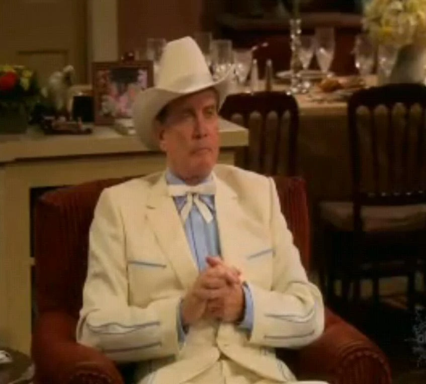 God, at least as he appears to Jim, is aged (at least 65), dressed in a white suit and wears a cowboy hat.